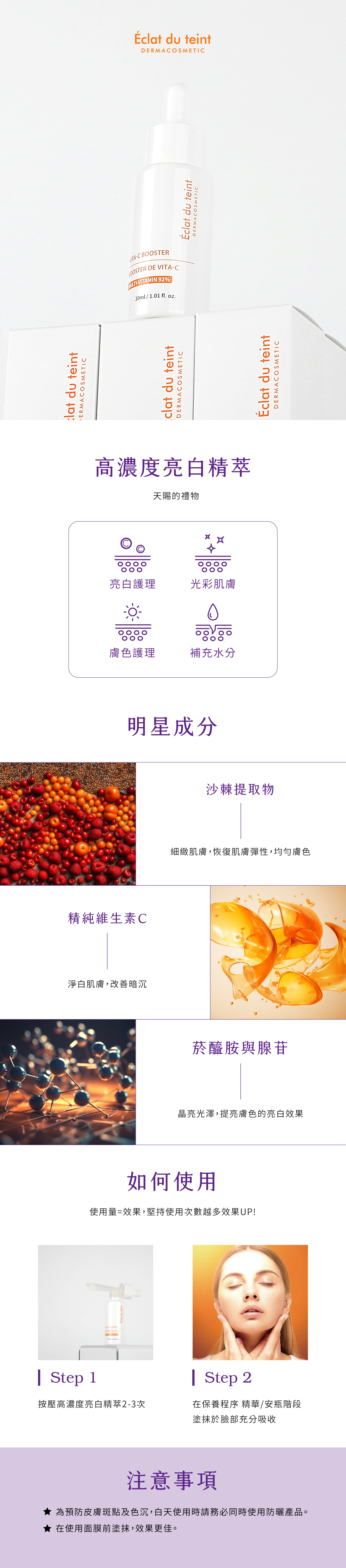 1.為預防皮膚斑點及色沉,白天使用時請務必同時使用防曬產品。